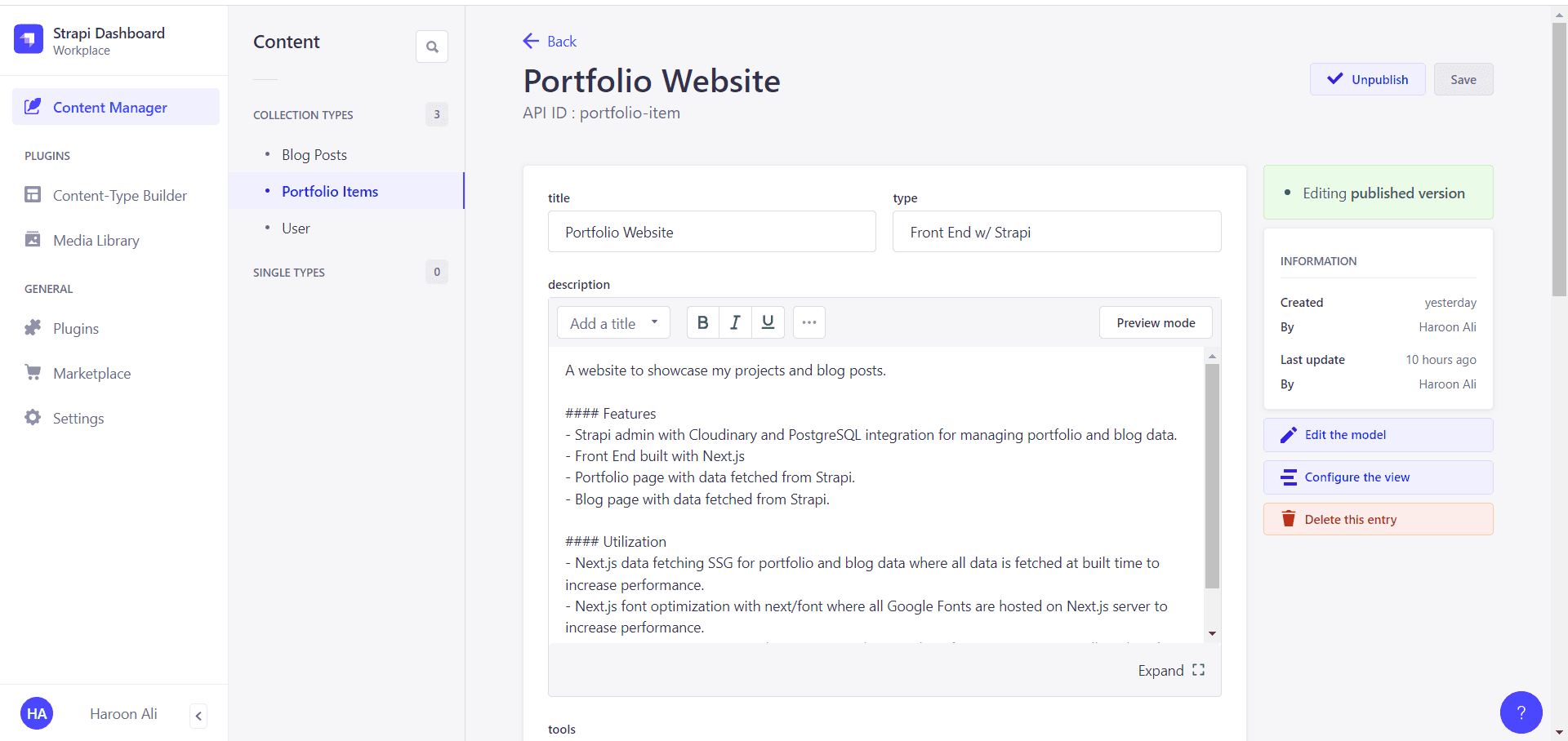 It has been so much fun using this new tech and I am absolutely blown away by how they make some things so much better! 😁. With Next.js I was able to implement data fetching SSG, font optimization using next/font and image optimization using next/image. These are all used to increase the performance of the application and they have blown my mind! With data fetching SSG all my portfolio items and blog posts which are fetched from Strapi are all fetched at built time so when the user accesses the website, all the data is already there in the first response that the browser receives from the server. With next/font, all Google Fonts used are hosted on the Next.js server and the application does not have to fetch them from the Google servers for every user. With next/image this website is using three parts of it. First, the quality of all images are reduced by 25% which lowers the image file size, increasing performance while not lowering the quality too much for it to look bad. Second, all images except the first three (I can control this) in a collection of images are lazy loaded, improving performance even more. Third, only relevant image sizes are loaded from Cloudinary. So let's say I have a 1080p image being fetched from Cloudinary and it's being shown in a 3 column grid. By using next/image and some configuration, Next.js will fetch an image around 500p size, increasing performance even more! Amazing! 😁. These React frameworks are so brilliant.